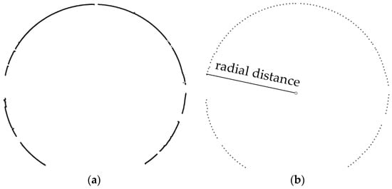 In addition, in order to verify the stability of the TS1 for deformation detection, the point deformation value of each cross-sectional point can be calculated based on the point cloud data, and then the absolute mean deformation value (the mean value of the absolute value of all point deformation values in each section) of each cross-section can be calculated and considered to be the whole deformation of the cross-section. The whole deformation deviation of the cross-sections measured by direct and reverse measurement at the same mileage can be considered to be the internal coincidence accuracy of TS1. To calculate the deformation of each cross-sectional point at every angle interval more accurately, the cross-sectional points obtained by the TS1 should be resampled first because of their high density. The resampling method we used here is to select the nearest cross-sectional point approaching to the direction line at each angle interval and the selected cross-sectional points are used to calculate the deformations in the corresponding direction. Figure 5a,b is the results before resampling and were resampled at an interval of 2° from the cross-section.