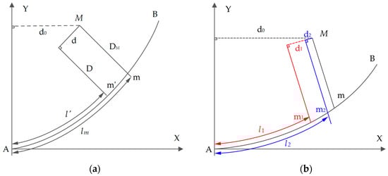 As shown in Figure 6a, AB is route central line of the tunnel, M is an instrument station point of an arbitrarily cross-section measured by the total station, and m is the projection point of point M in the route coordinate system. Because the coordinates and mileage of the starting point A and the end point B in the route coordinate system can be calculated by the design data of the route, the mileage of point M in route AB can be obtained by calculating the arc length of the point m. If an arbitrary point whose arc length is known on AB can be selected, its arc length is . According to Equation (1), the coordinates (, ) of point in the route coordinate system can be calculated, and then the shortest distance from point M to the normal line D of point can be solved according to Equation (2). If approaches 0, that is, when and m overlap, the mileage of point M can be calculated by the arc length . Therefore, the solution can be obtained using the principle of infinite approach and the iterative method, that is, make point close to point m infinitely through continuous iteration.