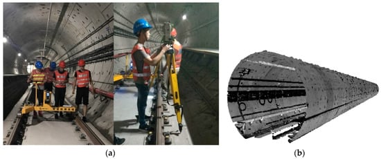 Data acquisition process. (a) Tunnel monitoring by the TS1 and total station; (b) point clouds measured by the TS1.