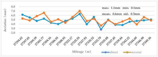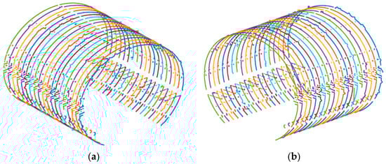 First, the method introduced in Section 3.2 of this paper was used to calculate the mileages of the cross-sections measured by the total station. In addition, the cross-sections with the same mileages as the cross-sections measured by total station were selected from the cross-sectional point clouds obtained by direct and reverse observations through the TS1. Although the mileage interval of the cross-sections obtained by the TS1 can reach 1–2 cm, the cross-sections themselves are discrete. There is no guarantee that the cross-sectional point clouds that fully accord with the mileages of the cross-sections measured by total station exist; therefore, the nearest cross-sections to the mileages were selected. The results of selection indicate that the mileage differences of the corresponding cross-sections obtained by the TS1 and total station are all within 5 mm. Figure 8a,b is the cross-sections that were selected from the cross-sectional point clouds obtained by direct and reverse measurements, respectively, which correspond to the mileages of the cross-sections measured by total station.