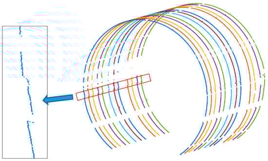 The main function of the data processing module is to fuse the multi-sensors data, and the principle used is to align the data of each sensor based on the time stamp. All acquired data should be first checked for continuous linear change. If there is a significant error point, it should be eliminated as a gross error; otherwise, the next step should be done. Finally, the average values of the mileage data obtained by the two odometers are calculated and considered to be the final mileage data. As mentioned in the previous part of the article, the y coordinates of all point clouds obtained through the helical mode of the laser scanner are zero; thus, the mileage data are used as the y coordinates (along the tunnel direction) of the point clouds. The software finally outputs point cloud data in LAS format, which includes x and z coordinates obtained by laser scanner, mileages, gauges and intensities of the cross-sectional point clouds. The original y coordinates of point clouds obtained by laser scanner are eliminated in the LAS format, and the x coordinates, mileages and z coordinates are considered as the new three dimension coordinates of the cross-sectional points.