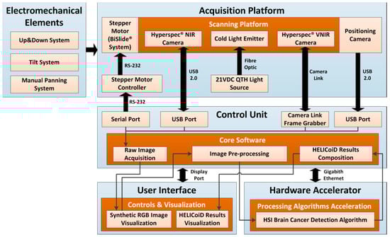 The control unit (CU) is responsible for managing all the subsystems that comprise the demonstrator. This CU is a computer based on an Intel® Core™ i7-4770k 3.5 GHz quad-core processor, with 8 GB of Random Access Memory (RAM) and a high-capacity 512 GB solid-state drive with write speeds exceeding 500 MB/s. Specific software was developed to manage and integrate the different elements that conform the acquisition platform, allowing the user to perform the HS image acquisition in an easy and effective way. Furthermore, the CU is in charge of executing the HS brain cancer detection algorithm together with the hardware accelerator in order to finally present the tumor boundary prediction.