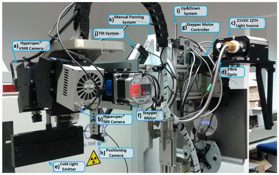 The HELICoiD demonstrator acquisition platform. (a,b) VNIR and NIR HS cameras mounted on the scanning platform; (c–e) QTH light source connected to the fiber optic system for the light transmission to obtain cold light emission in the scanning platform; (f,g) Stepper motor coupled to the spindle and connected to the stepper-motor controller to perform the linear movement of the cameras; (h) Positioning of the RGB camera used to identify the position of the cameras’ field of view (FOV); (i) The Up&Down system used to focus the HS cameras; (j) and (k) Tilt and manual panning systems employed to correctly orientate the scanning platform.