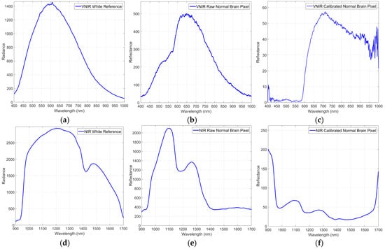 Figure 3a shows the white reference tile spectrum obtained with the VNIR camera, while Figure 3b,c respectively present raw and calibrated spectrum examples of normal brain tissue pixels. In Figure 3d the representation of the white reference tile spectrum obtained with the NIR camera can be seen, and in Figure 3e,f, the raw and calibrated spectra of a normal brain tissue pixel are shown. Based on the repeatability experiments performed with the system and taking into account that the white reference tile is used only a few minutes for the calibration, through measurements it is confirmed that the spectrum of the certified white reference tile does not show perceptible changes over time.