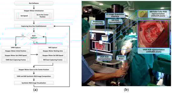 (a) HS image acquisition software flow diagram; (b) HS image acquisition user interface (and the RGB representations of each HS cube) being used during a neurosurgical intervention at the University Hospital Doctor Negrin of Las Palmas de Gran Canaria (Spain).