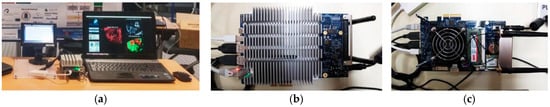 The MPPA® EMB01 board contains a standard host ×86 ComExpress module working as an embedded computer, and a carrier board containing the MPPA-256 many-core chip. Figure 5a shows the MPPA® board (in the center of the image) connected to a preliminary environment developed to execute the hardware accelerated part of the algorithm. The host module side of the board (Figure 5b) is composed of an AMD G-T40E Dual Core Processor with an integrated graphics processor unit (GPU) running a CentOS 7 GNU/Linux operative system (OS) instance with 4 GB of RAM, 1 Peripheral Component Interconnect Express (PCIe) Gen2×2 for communication with the MPPA®-256 many-core chip, and a 16-GB solid-state drive (SSD) as a system disk. The carrier board can be seen in Figure 5c. It features an MPPA®-256 many-core processor (under the fan). It also contains 4 GB of RAM and 64 MB of flash memory plus the host PCIe Gen2×2 port to communicate with the dual core processor.