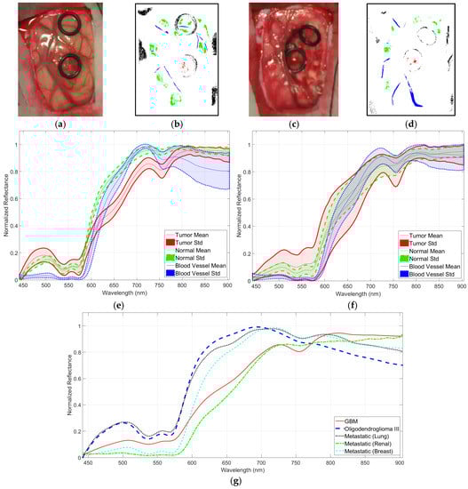 (a) Synthetic RGB representation of a VNIR HS cube of the a patient’s brain surface affected by a metastatic breast carcinoma (bottom marker) identified before resection started and (b) the training map where normal tissue, tumor tissue, blood vessels/hypervascularized tissue, and background were labeled using green, red, blue, and black colors, respectively; (c,d) Synthetic RGB representation and training map of the same patient but in an advanced stage of the tumor resection; (e) Mean and standard deviation of the pre-processed labeled spectral signatures of one patient affected by a GBM tumor (red), with labeled normal tissue pixels (green), and labeled blood vessels/hypervascularized tissue pixels (blue); (f) Mean and standard deviation of the pre-processed labeled spectral signatures of 13 patients affected by GBM tumors (with the same color identification); (g) Mean values of the pre-processed labeled spectral signatures of each type of tumor available in the training dataset.