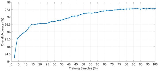 In order to determine the suitable percentage of samples of the training database that should be used to train the supervised algorithm, several experiments to generate and evaluate the supervised model were carried out employing different number of training samples. Each experiment was performed following a 10-fold cross-validation method to calculate the average overall accuracy result. Figure 7 shows the overall accuracy results varying the percentage of training samples with increments of 2%, starting at 2% and finishing at 100%. The evolution of the overall accuracy shows that when more than 75% of the training samples are used, the results stabilize, with overall accuracy of around 97.5%. With this experiment, it can be seen that there is no overfitting effect and the use of all the training samples will provide the best classification map.