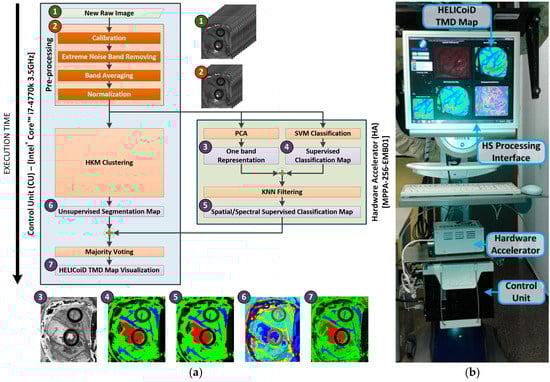 The data flow sequence of the implementation follows the next steps. Firstly, the raw image is pre-processed on the CU and the resulting HS cube is sent to the HA through the Gigabit Ethernet interface, to be employed as the input of the PCA and SVM classification algorithms. The same HS cube is used in the CU as the input of the HKM clustering algorithm. Secondly, HKM clustering is executed on the CU, while the spatial–spectral supervised classification—PCA, SVM classification and KNN filtering—is executed on the HA. Both the unsupervised and the supervised stages are executed simultaneously. In addition, the PCA algorithm and the SVM classification are executed in parallel in the HA. Finally, once the previous stages are finalized, the MV algorithm is executed on the CU to compute the final HELICoiD TMD map. This TMD map is a RGB representation of the first three major probabilities per cluster obtained from the HKM clustering algorithm, where the brain tumor is marked in red. This image is shown to the user (the neurosurgeon) through the HS processing interface. Figure 8b shows the different parts that comprise the HELICoiD demonstrator in relation to HS data processing.