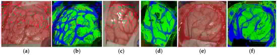 Normal brain image results obtained from the validation database employing the HELICoiD demonstrator: (a,b) synthetic RGB image and TMD map of the P1C1 HS image; (c,d) synthetic RGB image and TMD map of the P2C1 HS image; (e,f) synthetic RGB image and TMD map of the P3C1 HS image.