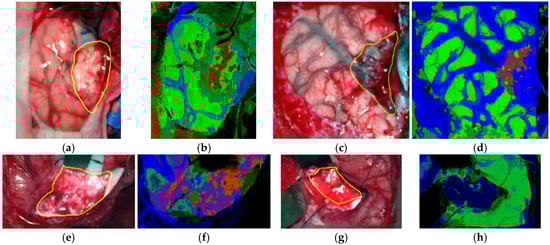The TMD maps of the validation database obtained by the HELICoiD demonstrator during the surgical operations and their respective synthetic RGB images are shown in Figure 9 and Figure 10. The TMD maps are represented in four colors that can be mixed depending on the density of each class presented in the image. Figure 9 shows the results obtained from the normal brain images. In these results, it can be seen that the system does not present any false positives in the parenchymal area, and normal tissue and blood vessels are clearly identified. Furthermore, bright pixels, which can be found in the images due to the light reflections over the arachnoid of the brain or due to the presence of surgical serum in the surface, are identified as background pixels. On the other hand, Figure 10 shows the results obtained from the HS images of the brain surface affected by a tumor, where the tumor areas are surrounded with a yellow line in the synthetic RGB representations. These results offer a clear indication that the HELICoiD demonstrator is able to identify the tumor tissue presented in the images. In Figure 10b, there are some false positives in the bottom corner of the TMD map, however, this false information is located outside the area of exposed brain parenchyma and thus, it does not affect the neurosurgeon decisions during the tumor resection. It is worth noting that two of the cases (Figure 10b,d) identify two tumor types (grade II oligodendroglioma and grade I meningioma) for which there are no spectral signatures within the training database. These results highlight the robustness and the generalization capabilities of the HELICoiD demonstrator to identify other types of tumor rather than only the ones available in the HS training database. Finally, it should be mentioned that the tumor identification becomes more difficult when the tumor is located deeper in the brain. Figure 10f,h show the TMD maps of GBM tumors at an advanced stage of the surgical procedure. It can be seen that, in case of Figure 10f, the tumor tissue is clearly identified although it is located in a deep layer. However, in Figure 10h, there is no correct identification of the tumor tissue due to problems with shadows and the presence of extravasated blood in the tumor area. Since HSI is not able to penetrate into the surface, extravasated blood present in the image is identified as a hypervascularized tissue class (blue color) in the TMD map.