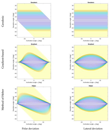 The surface orientation weighting of the geodesic distance is illustrated in the contour plot in the first row of Figure 1. The first column shows the polar deviation of the coordinates and the second column shows the lateral deviation, parameterized by the inclination angle and the deviation angle , as illustrated in Figure 3. For the following methods a balanced weighting over all inclination angles both for the polar and lateral deviation is favored, as provided by the geodesic distance.