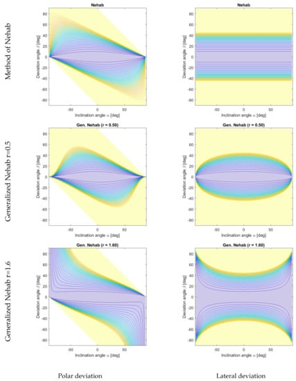 The influence of varying r on the behavior of the surface orientation normal penalty function is shown in Figure 2. It can be seen that with the generalized method of Nehab penalizes steeper slopes stronger than the original method of Nehab (equivalent to ) and weaker than the gradient-based method (equivalent to ). On the other hand, with the proposed method exhibits a more tolerant behavior towards steeper inclination angles than the original method of Nehab, resulting in a global behavior that is reasonably close to the geodesic penalty in both the polar and lateral deviation directions. The value of the parameter r might still be further optimized.