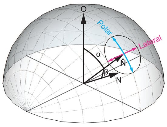 The distance between a two surface normals and is expressed by means of the horizontal polar coordinate system. The distances in Figure 1 and Figure 2 are measured in lateral and polar directions using angles and . The former describes the angle between the given normal and the the upright vector O, the latter defines the angular deviation between the normals and .