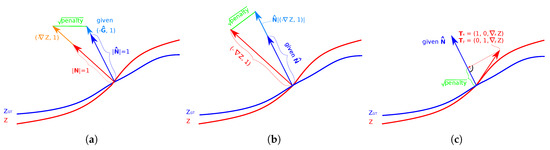 In this method, the surface normal constraint optimizes the sum of squared projections of a set of surface tangent vectors , as defined in Equation (7) through Equation (9), of the reconstructed surface Z onto the given normal field . This surface normal penalty has been adopted previously in several approaches (e.g., [21,27,28,29,30]). The projection is illustrated in Figure 4. Note that the lowest penalty 0 is reached when the tangent vector is precisely orthogonal to the given normal vector . We first consider the formulation as described by Nehab [26] by formulating an overdetermined linear system of sparse equations: