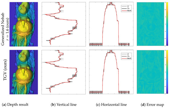 The function in Equation (37) consists of a depth and an orientation constraint as well as the TGV regularization terms. The depth constraint (i.e., the third term of Equation (37)) enforces the depth solution Z to stay in the vicinity of our noisy initial depth map . The orientation constraint (i.e., the fourth term of Equation (37)) enforces to stay in the proximity of the given surface gradient estimation . The TGV regularization part comprises a first and a second order term (first two terms of Equation (37)). The latter represents the TV component and penalizes the -norm of the second order gradient field, which forces the gradient field to be piecewise constant. The former enforces the approximated gradient of the depth map to stay in the proximity of the auxiliary gradient field also through an penalty.