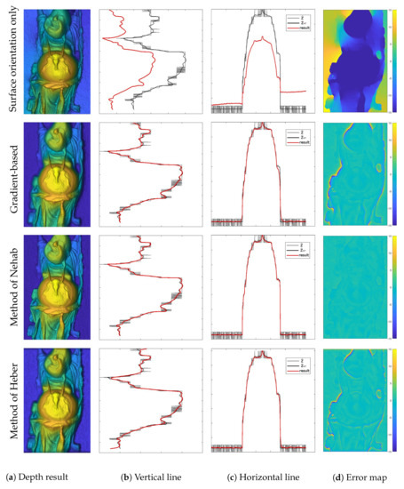 defines the vector of pointwise 2-norms and the symbol ⊙ denotes the operator for the point-wise product, also known as Hadamard product. This method is conceptually similar to the gradient-based method described in Section 4.3, also here the same depth constraint ensures a result in the proximity of an initial depth solution . However, the surface orientation constraint used in Heber’s method exploits the given normal field directly instead of the gradient field . Here the normalization of by division by the length of the vector is overcome by multiplying the term on one side by , which leads to a convex problem [41].