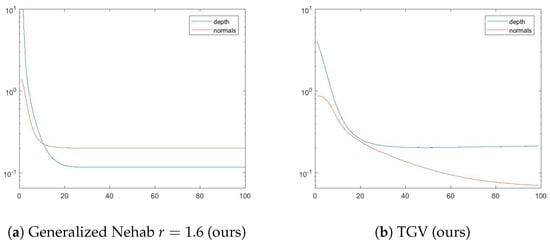 Convergence analysis of the two winning methods: the generalized Nehab with (a) and the TGV (b). Distances to the ground truth depth and surface normals are shown after each iteration, plotted with a logarithmic y-axis for better visibility.