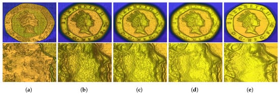 Real world evaluation of a coin object acquired by a multi-line scanner. The acquisition setup was previously described in detail in [37]. (a) ; (b) Gradient-based; (c) Method of Nehab; (d) Generalized Nehab (ours); (e) TGV (ours).