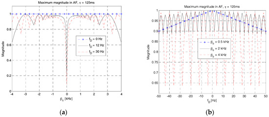 where . The derivation of (11) is given in the Appendix. As evident from (11), the magnitude of varies depending on τ, fD and βc [16]. However, the parameter fc does not affect the magnitude of AF. Further, we analyze the effect of AF in (11) on fD and βc with the symbol duration being fixed to 125 ms.