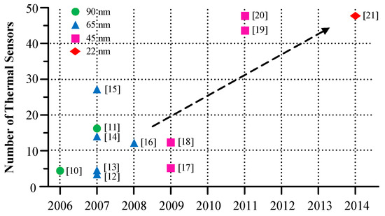Trends in the number of embedded thermal sensors in VLSI systems.