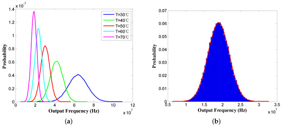 However, due to environmental uncertainty and process variation, the accuracy of output frequency is highly susceptible to several factors, such as variations in process parameters and fluctuations in supply voltage and ambient temperature. Generally, these noise sources can be divided into two main categories, i.e., dynamic noise and static noise. Dynamic noise represents the variation in the accuracy of specific sensors over time, which is caused by fluctuations in supply voltage and ambient temperature. Static noise means variations in the circuit parameters, including load capacitance, oxide capacitance, length/width ratio, etc. To describe the statistical characteristics of output frequency observations under the influence of noise, the following Monte Carlo (MC) simulation is performed using Equations (1)–(4) with 100,000 samples for each different temperature, ranging from 30 C to 70 C with an increment of 10 C. All the random variables are assumed to be the normal distribution with mean values and standard deviations specified in Table 1.