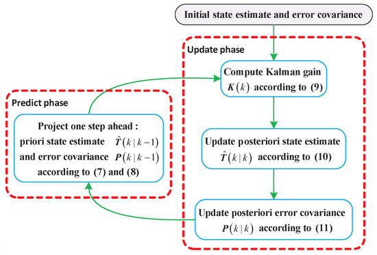 where represents the Kalman gain matrix, and denotes the covariance matrix of measurement noise. The framework of the Kalman filter algorithm is illustrated in Figure 6.