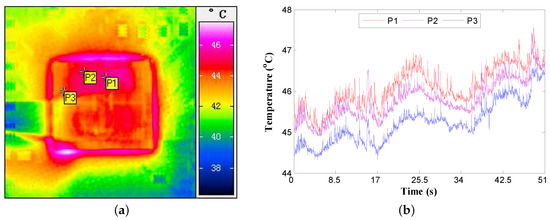 In this section, the performance of our temperature estimation approach is verified using the real thermal traces obtained by the above infrared temperature measurement setup. In what follows, we consider the case that three thermal sensors (denoted as P1, P2, and P3) are placed on the chip (see Figure 7a), and we try to calibrate their temperatures from the noisy sensor observations. It should be noted that the approach is the same for more than three sensors. The correlation coefficients among all three sensors are calculated according to Equation (12) as shown in Table 2, and the correlation threshold () is set to 0.8. The random parameters of thermal sensors are assumed to be of normal distribution, and we set the mean values of these parameters to be the standard values used in the 180-nm fabrication process (see Table 1). The dynamic noise source is assumed to have a supply voltage () fluctuation. Then, the MC simulation is performed based on Equations (1)–(4) to generate the noisy sensor readings that are used to test our temperature estimation. All the simulations are implemented by MATLAB code running on an Intel Core (Intel Corporation, Santa Clara, California, United States of America) 3.2 GHz computer with 16 GB synchronous dynamic random access memory (SDRAM).