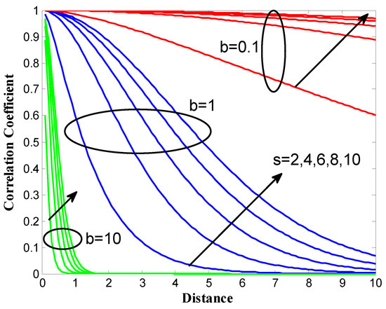 where and denote the coordinates of any two sensors. The shape of the spatial correlation function is regulated by the two real parameters b and s. To facilitate for our spatial correlation modeling, a rich set of correlation functions can be obtained by varying b and s, as shown in Figure 8. In our case, b and s are set to 1 and 8, respectively.