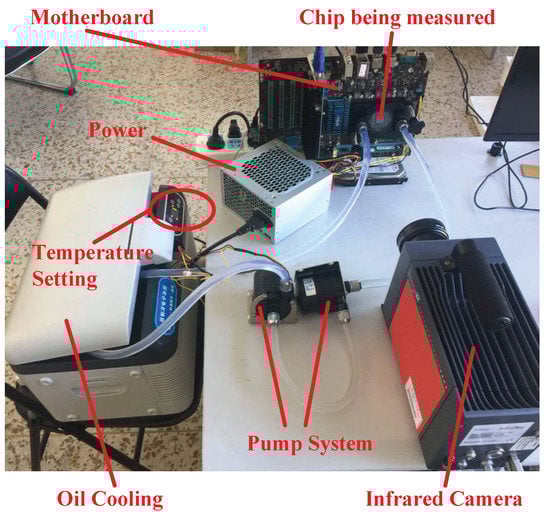 To track the thermal behavior of processor in real-time, an oil-based cooling system is designed to replace the infrared opaque metal heat sink. Once the original metal heat sink is removed, we need an infrared transparent heat sink to dissipate the generated heat adequately. To keep the chip working within a safe temperature range, a distinctive heat sink is devised that contains two layered sapphire windows (with an around 4-mm thickness for each). The proposed infrared temperature measuring equipment is depicted in Figure 9. As compensation for the conventional thermal interface material (TIM), the sapphire window on the top of the die is used to improve lateral heat spreading and increase the thermal capacitance. Due to the relatively high thermal conductivity, large specific heat capacity, and good transparency in the infrared range, mineral oil is a suitable choice for a coolant [44,45]. The mineral oil (Sigma M3156 (Sigma-Aldrich Corporation, St. Louis, Missouri, United States of America)) is persistently pushed through the inlet by an external direct current (DC) pump that circulates between the two layers of sapphire window to transfer the heat. In order to keep the flow laminar, the clearance of two sapphire windows is restricted to 1 mm. The oil temperature is monitored using a thermostat. The detailed thermal traces of the SPEC CPU 2006 (Standard Performance Evaluation Corporation (SPEC), Gainesville, Virginia, United States of America) benchmark workloads [46] are captured using a mid-wave infrared camera (InfraTec ImageIR® 8300 (InfraTec GmbH Infrarotsensorik und Messtechnik, Dresden, Germany)). Because the lightly doped and undoped silicon are partially transparent at the mid-wave infrared range, the chip temperature can be measured through our tailored infrared transparent heat sink. The chip being tested is a 45-nm AMD Athlon II X4 610e (Advanced Micro Devices, Inc. (AMD), Santa Clara, California, United States of America) quad-core processor [47] operating at 2.4 GHz. The image of our experimental setup is exhibited in Figure 10. To demonstrate the effectiveness of our infrared thermography technique, a few examples of thermal traces are shown in Figure 11.