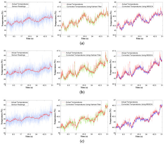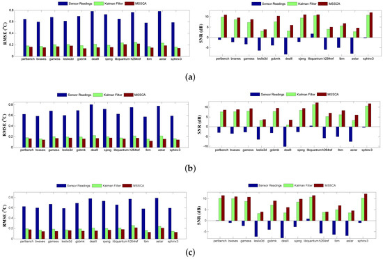 Figure 12 highlights the temperature tracking results of three sensors running the gamess benchmark. The standard deviation of the is set to be 5% of its mean value. The results of other benchmarks are similar. There are four different color curves plotted in the figure for each sensor: actual temperatures, noisy sensor readings, Kalman filter-corrected temperatures, and MSSCA-corrected temperatures. The simulation lasts for 51 s, and contains 3000 sample points, i.e., the sampling interval is 17 ms. From the results, it can be observed that the predicted temperatures using the MSSCA are much closer to the actual temperatures than those using the Kalman filter. In addition, the comparison results of the root-mean-square error (RMSE) and the signal-to-noise ratio (SNR) generated from the Kalman filter and MSSCA are shown in Figure 13. Experiments are performed with 100 time instances. From the results, it can be seen that the prediction performance of the MSSCA is clearly superior to that of the Kalman filter, with a lower RMSE and a higher SNR under all three sensors. Furthermore, an intuitive comparison of the prediction accuracy for different benchmarks is given in Figure 14. In Figure 14b (see the dealII benchmark), the RMSE of MSSCA can be reduced by 0.6 C (from 0.8 C to 0.2 C) relative to the noisy sensor readings. In Figure 14a (see the gobmk benchmark), the SNR of MSSCA is increased by 14.1 dB (from −3.8 dB to 10.3 dB) compared with the original sensor readings.