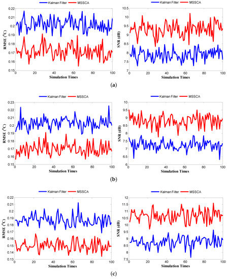 The results of average prediction accuracy under different noise standard deviations are reported in Table 3. Comparing the results, it can be observed that the MSSCA still exhibits superior prediction performance even if the noise standard deviation increases. In the case of 10% noise standard deviation, MSSCA can obtain a 1.2 C reduction in RMSE and a 15.8 dB increment in SNR compared with assuming the sensor readings to be ideal. Compared with Kalman filter, the average prediction accuracy increments of the MSSCA are reported in Table 4. As seen in Table 4, our MSSCA can achieve a 17.9% reduction in RMSE and a 45.8% increment in SNR. Note that the results of improvement for three sensors are slightly different. This is because the trends in temperature variation and the characteristics of observation data for different sensors lead to different degrees of improvement for prediction performance.