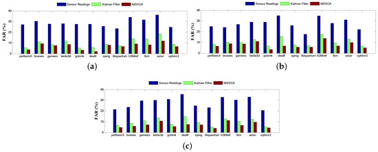 Comparison of the false alarm rate (FAR) for different benchmarks. Noise standard deviation is 5%. (a) P1 sensor; (b) P2 sensor; (c) P3 sensor.