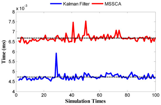 For each sensor calibration, the execution time comparison between the Kalman filter and the MSSCA is shown in Figure 16. Although the Kalman filter is clearly faster than the MSSCA, it can still achieve on-line temperature estimation. This is because the average execution time of the MSSCA (about 0.0066 ms) is obviously shorter than the sampling interval (17 ms). The requirement for our temperature estimation technique to be exploited by a processor is that additional memory is needed to store the correlation coefficients among all the available sensors.