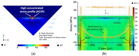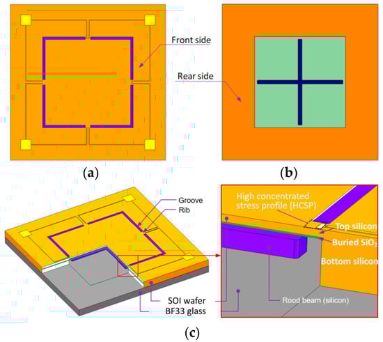 On the rear side, a rood beam structure is placed as shown in Figure 1b. The end of each rood beam is not connected with membrane edge but remains at a distance between them, which can be seen clearly in Figure 1c. Meanwhile, the rib width is equal to the groove width, and the rib length is equal to the rood beam width, which not only simplifies the fabrication processes, but facilitates the dimension variables optimization. By incorporating four grooves and a rood beam into the membrane, a high concentrated stress profile (HCSP) was anticipated to maximize the sensitivity. Meanwhile, a locally stiffened membrane (LSM) structure was anticipated to be generated to decrease the deflection of the plate but not reduce the stress around the HCSP.
