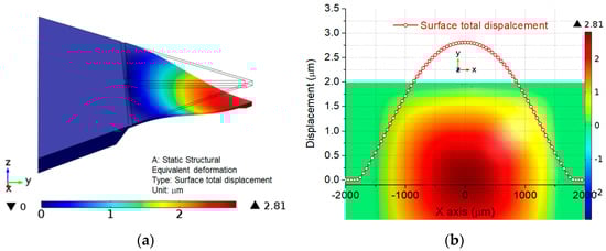 According to the ratio between membrane deformation and thickness, the deflection theory can be divided into small-deflection theory and large-deflection theory. Small-deflection theory is always chosen to describe the principle of the sensor but large-deflection theory is usually adopted to illustrate the phenomenon of nonlinearity error. Once the deflection exceeds the definite value compared to the thickness of the membrane, the large deflection theory works, and, then, linearity between deflection and pressure will change to nonlinearity []. Based on the large deflection curve, the relationship between pressure and deflection is no longer linear when the ratio of (membrane deflection)/(membrane thickness) is larger than 0.2 []. It indicates the small-deflection theory only works when the deflection is smaller than 1/5 of the membrane thickness. Thus, the maximum deflection should be less than 1/5 of the membrane thickness, which is beneficial for obtaining a low pressure nonlinearity error. The simulation of surface displacement only displays a 1/4 model of the membrane because of the symmetry. The maximum surface displacement appears at the center of the membrane as shown in Figure 4a. The maximum displacement value reaches 2.8 μm, which is almost 1/10 of the membrane thickness (30 μm), as shown in Figure 4b, and totally satisfies the principle of small-deflection theory.