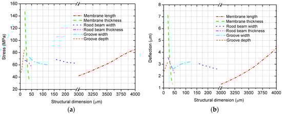 Mechanical performance variations versus the structural dimension variables: (a) stress variation; and (b) deflection variation.