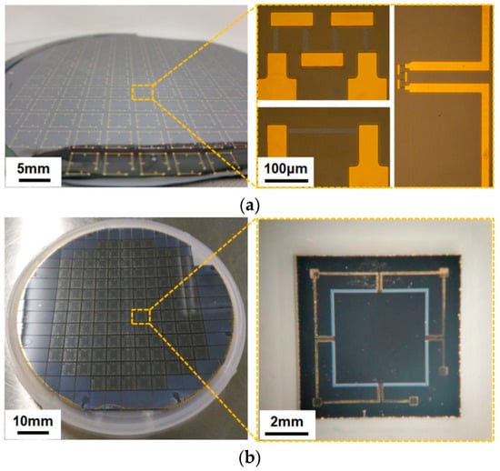 Photographs of the proposed sensor chip: (a) front side of the wafer after metallization and its two different pattern piezoresistors and (b) photographs of the sensor chip after laser cutting.