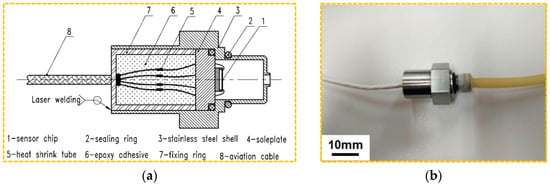 The pressure sensor is assembled with the fabricated sensor chip as shown in Figure 7a. The sensor is mainly constituted by chip, shell, soleplate, aviation cable, etc. The metal material of the external structure is 304 stainless steel which is beneficial to improve the corrosion resistance. To increase the sealing and insulation characteristics of the sensor, the epoxy adhesive (60% ethoxyline resin, 30% quartz powder, 10% dioctyl phthalate) is filled in the shell and solidified for about 24 h at room temperature (25 °C). An aviation cable is used to connect the sensor and the plug, which can resist high temperatures (>200 °C). To protect the welding spot, the fluororubber heat shrink tube is covered at the connection between every two wires. Between the stainless steel shell and fixing ring, laser welding is chosen for connection, which can improve the long term stability and application of the sensor. As a result, the assembled sensor is presented in Figure 7b.