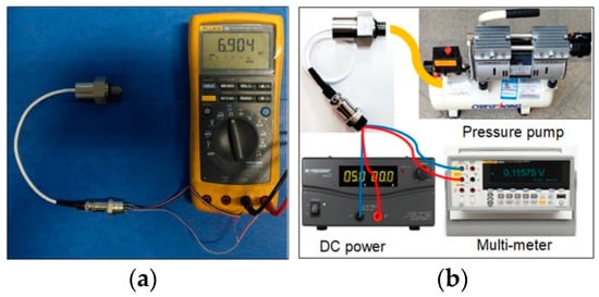 The performances of the sensor are measured and the experimental schematic diagrams for testing are shown in Figure 8. The bridge resistance is measured by a digital multimeter (VC890D). The pressure is from a pressure pump and the pressure value can be adjusted by controlling switch. To ensure the airtightness of the measurement, the joint between the sensor port and connecting tube should be twined several laps using the rubber belt. A constant voltage of 5 V is provided to the Wheatstone bridge of the sensor using a High Current Switching DC Power Supplier (Model BK1694). The output of the sensor at different pressure loads is read by a digital multimeter (FLUKE 8845A). The output voltages at different temperatures are measured in a high and low temperature test chamber (GDC4010) with the working range of −20 to 150 °C. To test the characteristics of the sensor at different temperatures, nine temperature points are tested in the range of −20 to 150 °C: −20 °C, −10 °C, 0 °C, 25 °C, 50 °C, 75 °C, 100 °C, 125 °C and 150 °C. The purpose is to check the temperature characteristic of the device. In the process of high temperature measurement, the test step change of pressure is set as 0.1 psi, namely, a total number of eleven test points is selected. Based on the pressure sensor calibration procedures, the pressure signals increase from low to high until 1 psi, and then decrease from 1 psi to 0. The above process is called “one trip”. For each temperature point, three trips are carried out for a precise measurement. For each test point in each trip, the output data will be not read until the pressure is stable. Finally, the various indicators of the sensor are calculated.