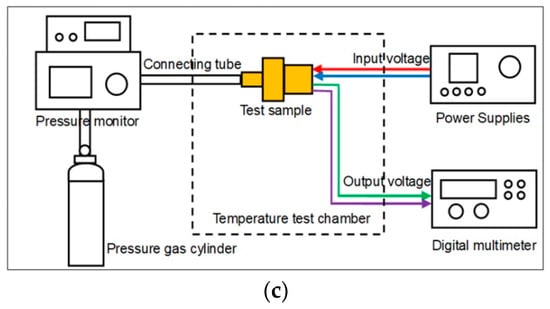 Experimental schematic diagrams for the proposed sensor: (a) test diagram for bridge resistance; (b) test diagram for output voltage at room temperature (25 °C); and (c) test diagram at different temperatures.