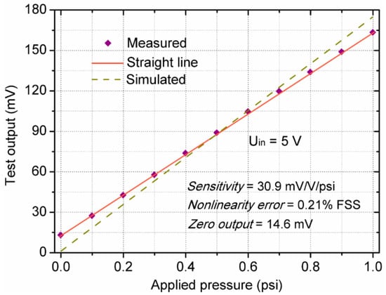 The performance of one pressure sensor is usually evaluated by the static characteristics of technical indicators including full scale output, sensitivity, pressure nonlinearity error, repeatability, hysteresis, zero output, accuracy, etc. []. The measured output voltage and pressure nonlinearity error are shown in Figure 9. In this paper, the accuracy is calculated using root of the sum squared to combine nonlinearity, repeatability, and hysteresis into a total accuracy percentage. Finally, the detailed technical data of the sensor at room temperature (25 °C) are listed in Table 3. The results illustrate that the proposed sensor achieves a high sensitivity of 30.9 mV/V/psi and a low nonlinearity error of 0.21% FSS (full scale span). Meanwhile, there is a deviation of 8.4% between the simulated and experimental results. It is illustrated that the estimated data are similar to the actual data, which proves the validity of the simulation and optimization methods.