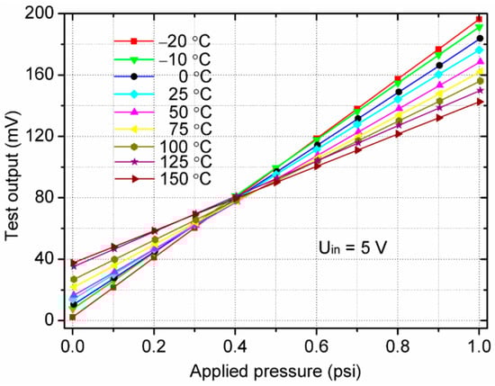 The sensitivity and zero output analyses are the study of change in output voltage with respect to the applied pressure at different temperatures. Figure 10 illustrates the relationship between the output of the sensor and the standard pressure under different temperatures. It can be observed that the lower the temperature is, the larger the output voltage is. It is also observed that the output increases linearly with the applied pressure. However, the output curves of the sensor at different temperatures are not coincident and there are also differences in the zero output voltage as well as the sensitivity, which demonstrates that the proposed sensor has a temperature drift. It is consistent with the conclusion of References [,].