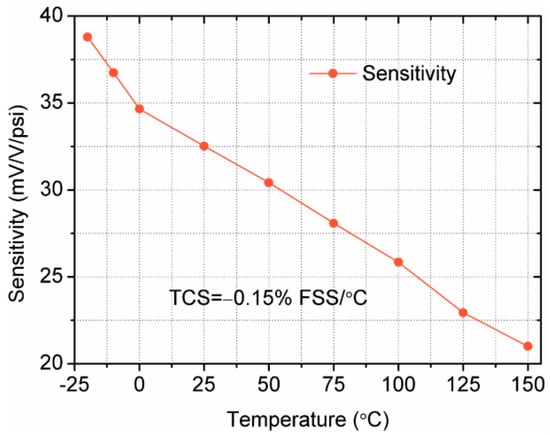 To be more intuitional, Figure 11 displays the sensor’s sensitivity changes with the temperature increasing when the test pressure is 1 psi. The results show that the sensitivity reduces almost by 50% when the temperature increases from −25 °C to 150 °C. This is mainly because the piezoresistive coefficient decreases when the temperature rises. However, the sensitivity is still as high as 21.2 mV/V/psi at 150 °C. The temperature coefficient of sensitivity (TCS) is calculated using the full output at 150 °C and reference temperature 25 °C, where the TCS of the sensor is −0.15% FSS/°C, indicating that the sensitivity of the sensor has a negative temperature coefficient.