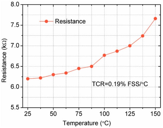 With the temperature increases, the resistance experiences a rise until reaching the largest value at 150 °C, as shown in Figure 13. Commonly, one requirement of analog electronics is the positive temperature coefficient of the sensitivity over the entire temperature range. Thus, the positive temperature coefficient of resistivity (TCR) has to predominate the negative temperature coefficient of the gauge factor []. Based on the resistance variation, TCR is calculated as 0.19% FSS/°C.