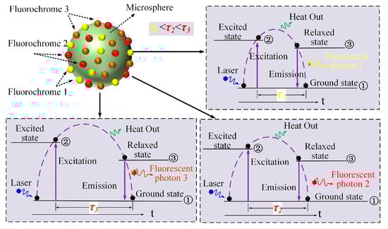 Figure 1 shows a schematic representation of laser excited fluorescence of a fluorescently labeled microsphere (green sphere) with three types of fluorochrome (fluorochrome 1: yellow ball, fluorochrome 2: red ball, fluorochrome 3: brown ball). The microsphere is irradiated by the laser photon (blue star) and the outer electron (black ball) transited from the ground state ① to the excited-signal state ② and then relaxed to a single state ③ with some energy lost in the form of heat. Upon returning to ground state, a fluorescent photon (fluorescent photon 1: yellow star, fluorescent photon 2: red star, fluorescent photon 3: brown star) is emitted. Each of the processes occurs with a certain probability, characterized by decay rate constants (k). The fluorescence lifetime is defined as the average length of time for the set of molecules to decay from one ② to ①, which is inversely proportional to the rate of decay (τ = 1/k) [18,19,20,21]. The corresponding fluorescence lifetimes of the three types of fluorochrome in Figure 1 are marked as τ1, τ2 and τ3 (τ1 < τ2 < τ3).