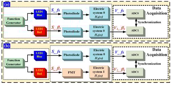 Two steps are taken for the calibration of light-pulse and hardware time-delay, respectively. Figure 5a shows the calibration of light-pulse time-delay, to ensure that S_fs and S_fl1 are synchronous. S_fs and S_fl1 are detected by the same photodiodes, processed with the same electric system 0 and then conserved by ADC0 and ADC1, respectively. The time-delay between V_fs and V1_fl1 is evaluated and the phase shift between the two channels of AFG3022C adjusted until the time-delay between V_fs and V1_fl1 is zero. So far, the time-delay error between the two channels of function generator and the response time differences of the two LEDs has been calibrated. S_fs and S_fl1 are synchronous. As illustrated in Figure 5b, S_fl1 is detected by a PMT and processed with electric system 1. The PMT and electric system 1 are the same as those used in actual cytometric measurement. The time-delay between V_fs and V2_fl1, which is the time-delay introduced by the photovoltaic conversion and electric systems can be acquired.