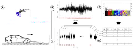 Flow chart of the proposed methodology. Several sensors connected to an IoT device (A,B); The real-time information of the sensors is trimmed intoltwo-second windows of data (C); Several statistical features that characterize the whole data are extracted from each data window (D); A machine learning approach based on genetic algorithms is applied to find a logistic model that can be used to accurately detect speed bumps (E).