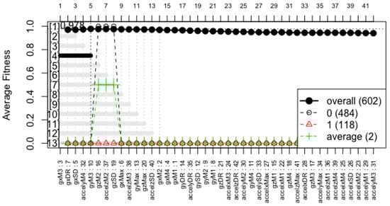 Data collection resulted in a total of 752 two-second recordings, with 42 features and a ground true label extracted from each, yielding a 752 × 43 matrix. Using this dataset, the genetic search generated 1000 models. Figure 3 shows the average accuracy throughout the 200 generations in which models evolved, and highlights that accuracy converged. That is, no more generations were needed. Similarly, Figure 4 shows that the frequency in which features appeared in the models had stabilized. There, it can be seen that the eleven most frequent features are above the expected random frequency, thus, even with more models the ranking would have stayed the same.