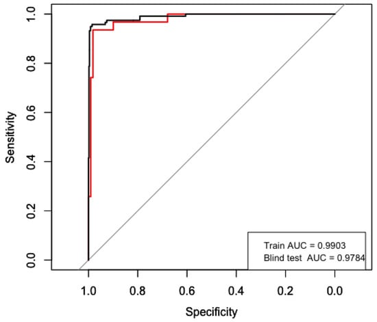 ROC curve of the representative model, black line = train performance, red line = blind performance.